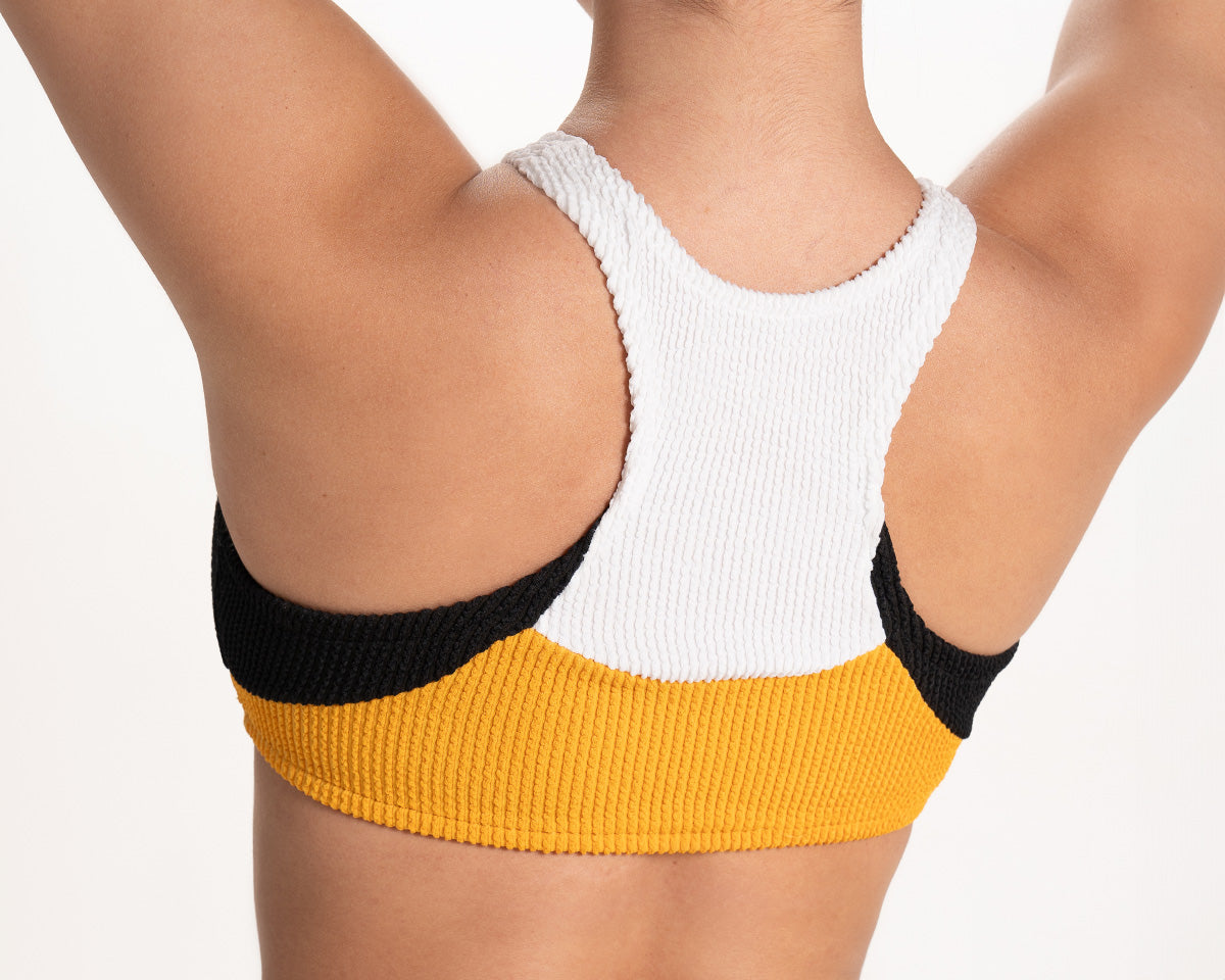 Adapt your style effortlessly with our sporty bikini. It's regular shaped bottom can be worn high up the waist or low on the hip, ensuring comfort and confidence. Featuring an abstract design in black, white, and yellow.